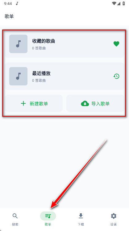 3.点击下方的歌单板块,即可看到收藏的歌曲、最近播放、新建歌单、导入歌单等功能。