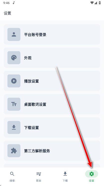 5.点击下方的设置板块,即可看到播放设置、桌面歌词设置、下载设置等功能。