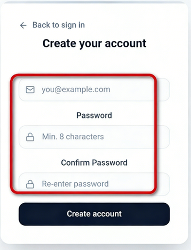 2、输入邮箱账号,一个8位数的密码,再次输入密码之后,点击Create account。