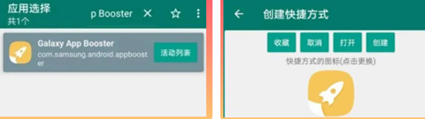 4、第三方软件创建快捷方式,我们启动程序APP,在程序列表找到galaxyappbooster这个软件,如果软件太多的情况下我们搜索下即可找到,然后点击活动列表打开程序即可,我们可以把程序添加到收藏夹里面下次打开更加方便点。