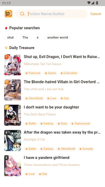 2.点击搜索栏输入小说名称或作者名进行查找,也可查看“每日宝藏”推荐列表,发现高人气作品。