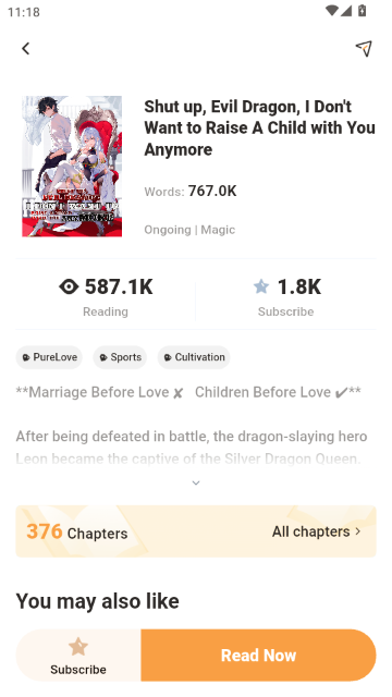 3.选择一本小说(如《Shut up,Evil Dragon,I Don't Want to Raise A Child with You Anymore》),进入详情页,查看字数、阅读量、标签及简介信息。