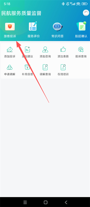 1、首先我们先进入app,可以看到顶部那排第一个的旅客投诉,我们点击它。