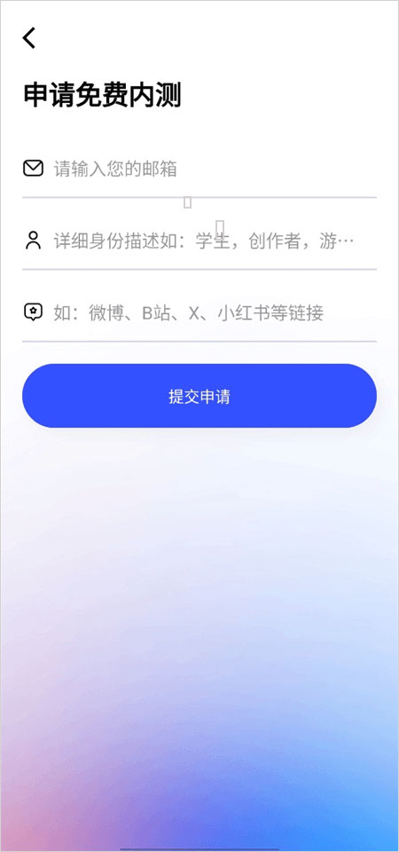 • 按页面要求填写邮箱、详细身份描述以及微博/小红书/B站等链接,填好以后点击提交