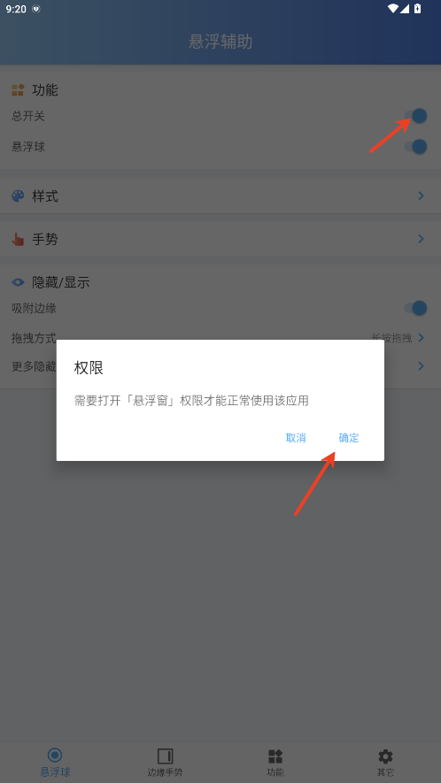 1.开启总开关,打开悬浮窗权限,