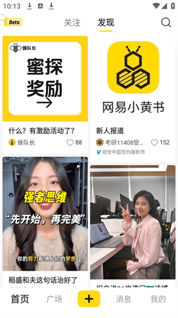 网易小蜜蜂是网易推出的年轻人分享交流生活日常的内容社区。在这里能轻松拥有想要的生活节奏,有超多实用有趣功能。可进行学历职业认证提升可信度与权威性,广场有热门评分榜单。有类似小红书的视频板块,支持创建群聊。软件特色鲜明,真实、有用、有趣、高效。亮点众多,能分享真实有趣生活,自由记录日常,围观评分榜单,嗨聊喜欢的话题,还有海量活动现金补贴。让大家尽情互动分享,享受精彩社区生活。