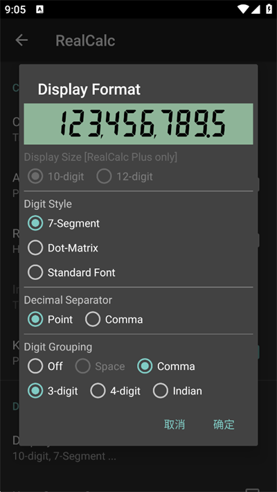 4、在弹窗中,可根据需求调整所需参数,调整完成后,点击弹窗右下角 “确定”按钮,自动返回设置页,设置立即生效,计算器显示样式同步更新。
