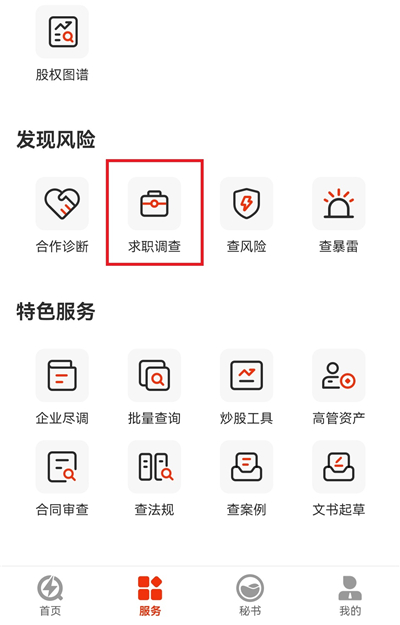 1、在【服务】这个页面找到【求职调查】,在发现风险这一栏里面。