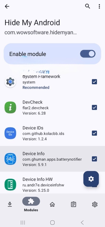 2、打开LSPosed,并启用 HideMyAndroid 模块以实现所需的目标包