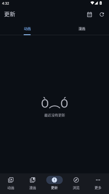 3、点击“更新”标签,查看动画与漫画的最新章节动态。当前无更新记录,页面中央显示“最近没有更新”提示。右上角提供日历视图与刷新按钮,便于规划追更时间或手动同步最新资源信息。
