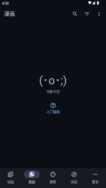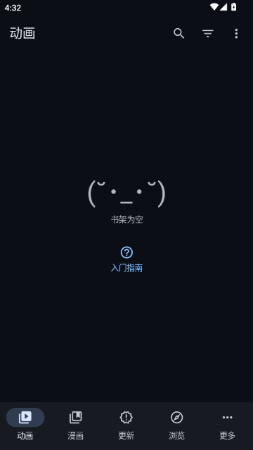 1、进入“动画”主页面,当前书架为空,显示可爱表情提示。底部导航栏包含五大功能模块,可点击“入门指南”了解基础操作,或通过顶部搜索、筛选和菜单按钮管理内容与设置偏好。