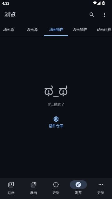 6、切换至“动画插件”子标签,当前未安装任何插件,页面显示“呃…尴尬了”提示语。下方设有“插件仓库”入口,点击后可添加第三方数据源,拓展平台外的动画资源覆盖范围提升实用性。
