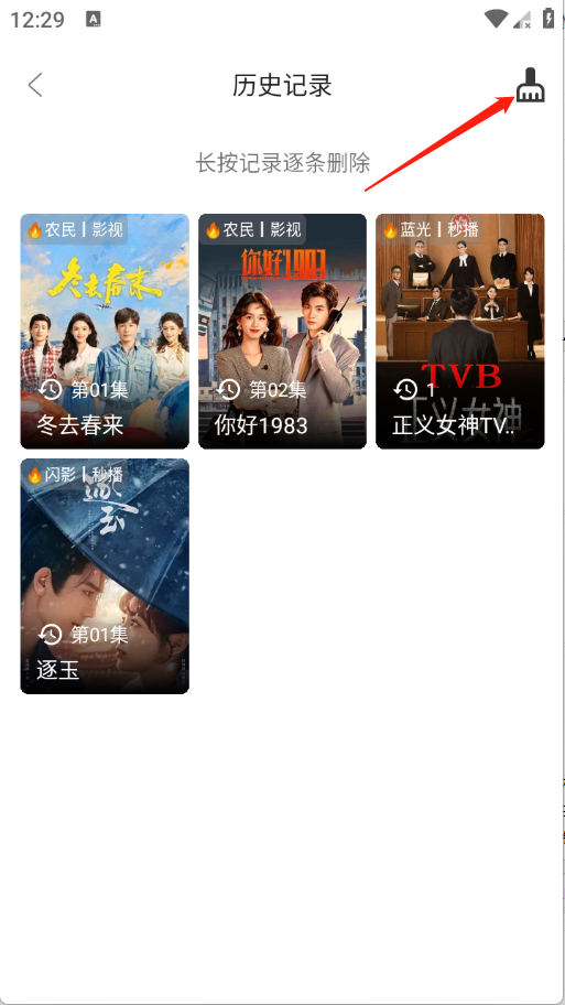 1、在我的页面点击观看历史。