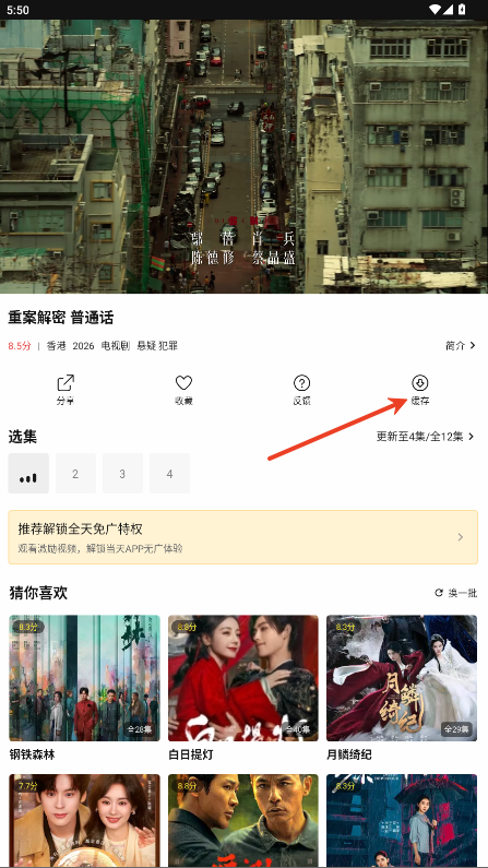 4.影片详情页点击 “缓存”,选择集数和画质,缓存完成后在 “我的缓存” 中离线观看。