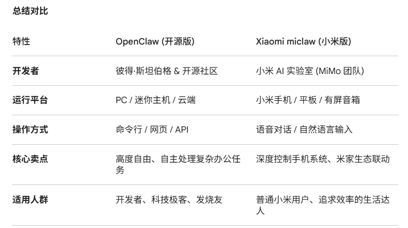2.一句话总结,OpenClaw是一个在实验室里能帮你写代码、干杂活的全能机器人;而Xiaomi miclaw是那个住在你小米手机里、帮你打理衣食住行的生活大管家。