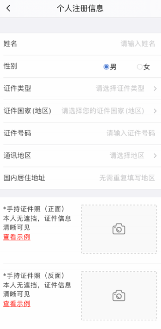 根据要求填写个人的相关信息进行验证,当证件类型为身份证时,需要进行人脸识别校验通过后即可注册成功,当证件类型不为身份证时,需要上传证件的照片,账号需要人工审核后可正常使用。