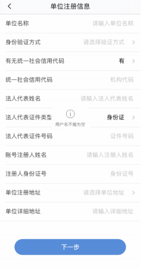 根据要求填写个人和单位的相关信息进行验证,单位信息需要填写对应法人的身份信息,以及注册人的身份信息,注册人的身份认证信息只能选择身份证的方式。当填写单位信息没有社会统一信用代码的时候账号信息需要人工审核通过后可正常使用。