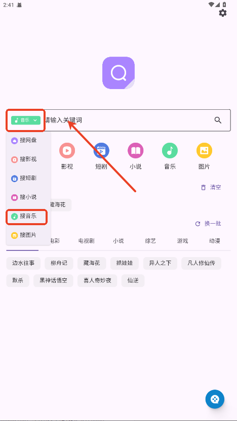 1.把词条标签更换成搜音乐,在搜索框内输入歌曲名,点击搜索。