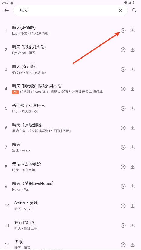 2.在歌曲右侧点击播放按钮。开始听歌。