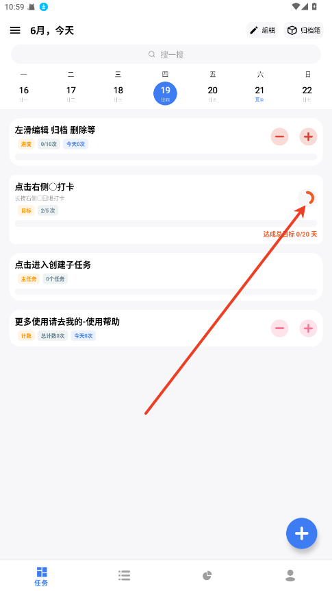 通过点击任务右侧圆圈按钮来打卡任务的进展。