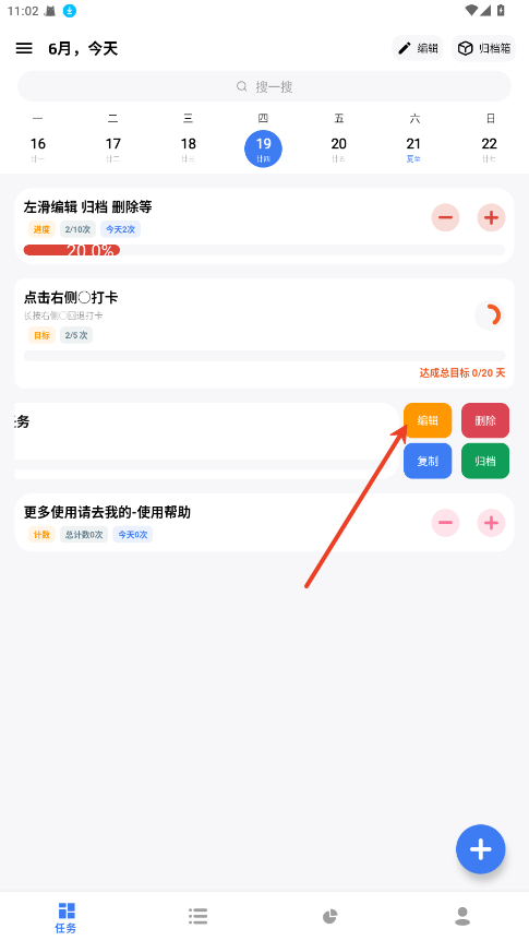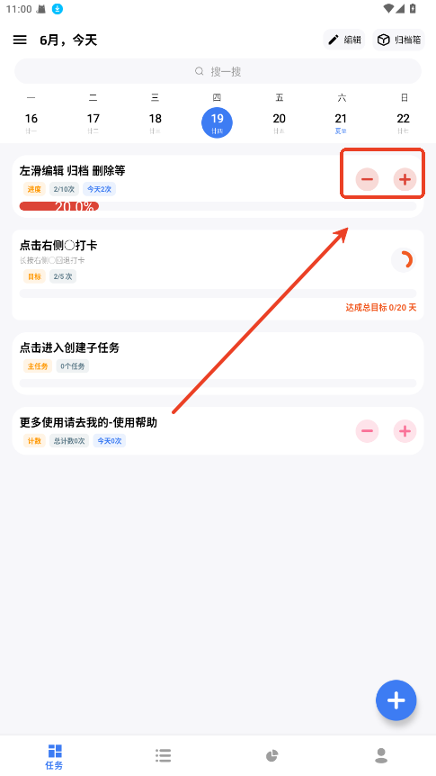 通过点击“+”或“-”按钮来更新任务的进展或减去已完成的部分。