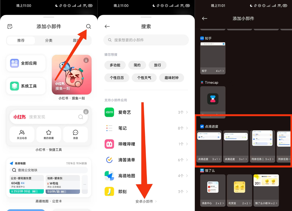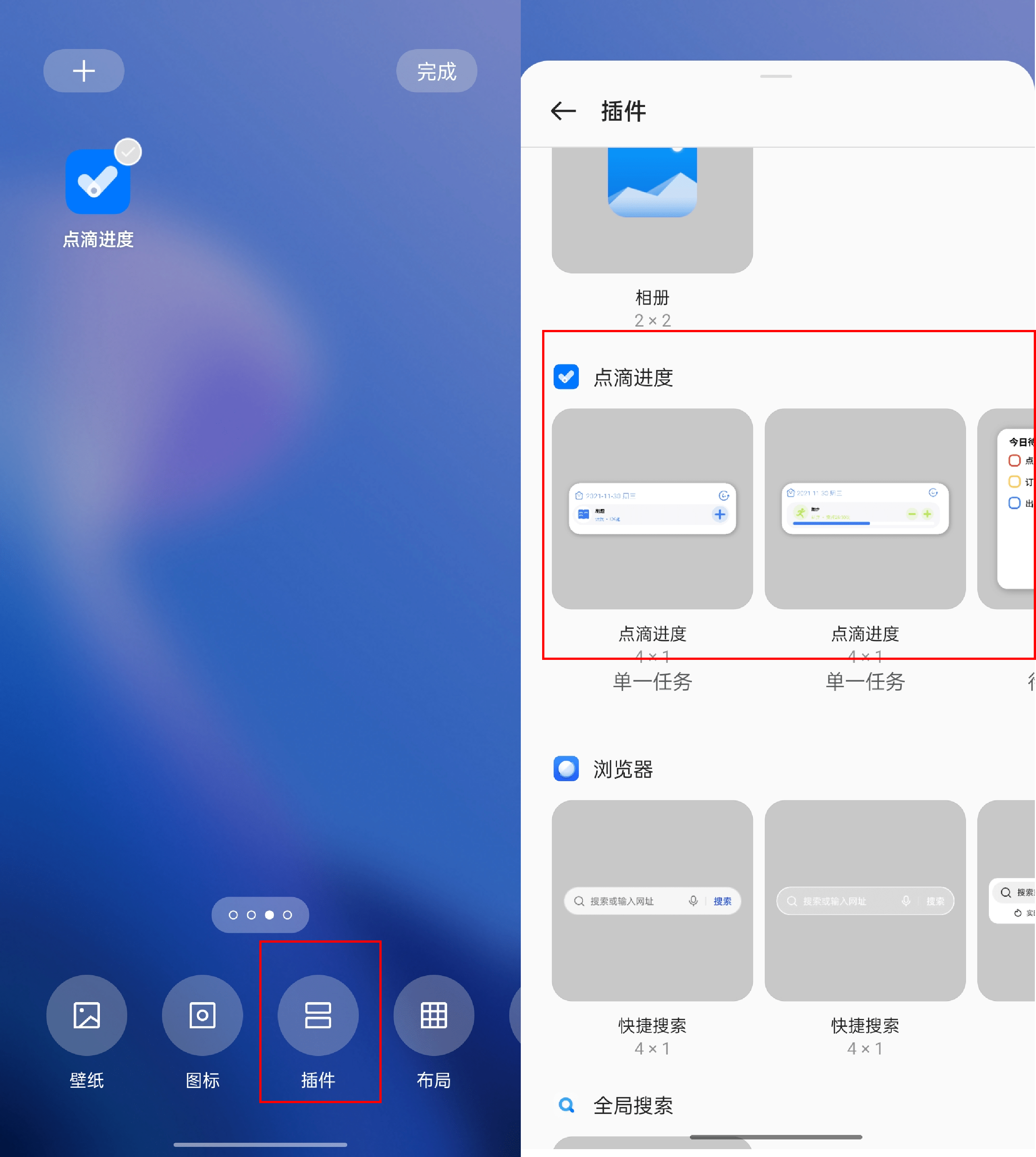 手机桌面双指捏合,点击底部添加小部件,点击右上角搜索图标,点击底部安卓小部件,找到点滴进度