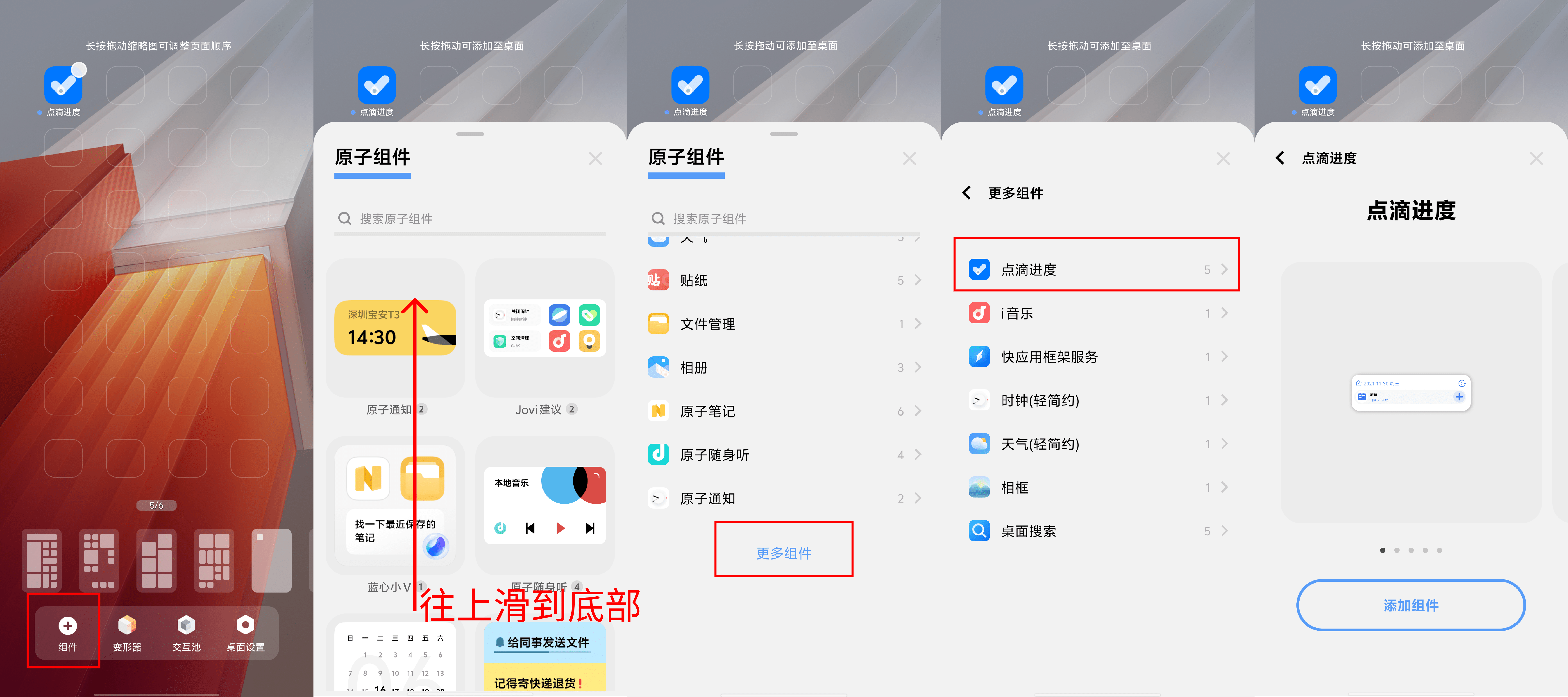 手机桌面双指捏合,点击底部组件,向上滑动到底部,点击更多组件,找到点滴进度