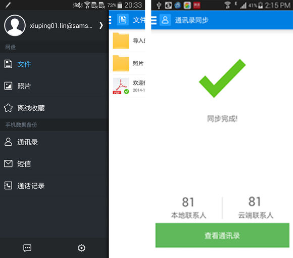 5.数据备份功能也是够贴心的。选择 “自动同步通讯录”,一键把本地联系人上传到云端,即便是换了新的三星手机或是使用三星平板也能随时下载使用,再也不用担心找不到电话,让人很有安全感。同样,与家人、恋人、朋友之间发过的短信也能备份到三星云,留作日后慢慢回忆。如果你有怀旧情结,那一定得好好体验~