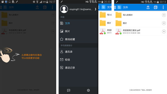 2.初次进入主界面,会提示我们点击左侧的菜单栏,向右滑动,可以看到应用主菜单。初次使用,我们会看到两个目录和一个文件,其中 “导入的照片” 是三星云从用户设备上自动扫描出的 “照片” 是默认为用户建立的目录。这个功能对于爱自拍,爱摄影的同学们来说真是很贴心。