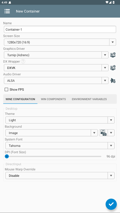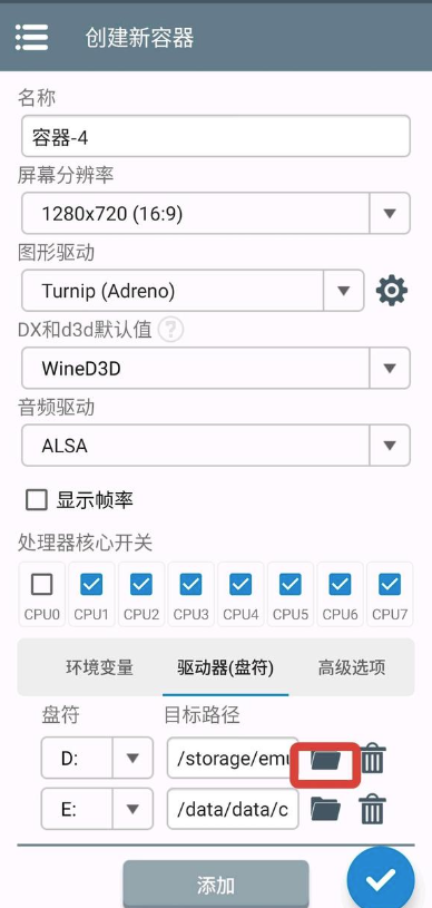 5.完成obb镜像安装操作后点击右上角的+号,然后创建的容器,输入各种参数,这样就完成了创造,点击右下角运行winlator模拟器就可以提取obb数据包了。