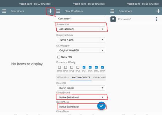 1.首先需要点击winlator右上角的“+”号创建容器,调节分辨率。