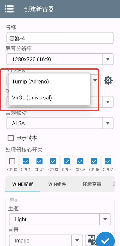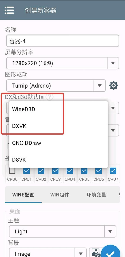 5.DX和D3D这里,如果是骁龙则选择DXVK,其他处理器选择wineD3D