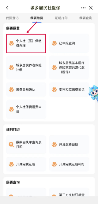 3.在【我要缴费】版块点击【个人社(医)保缴费办理】。