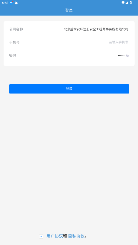下载app后需要输入公司名称、手机号以及密码登录。密码一般是由公司发放。