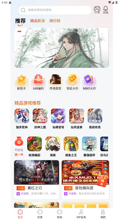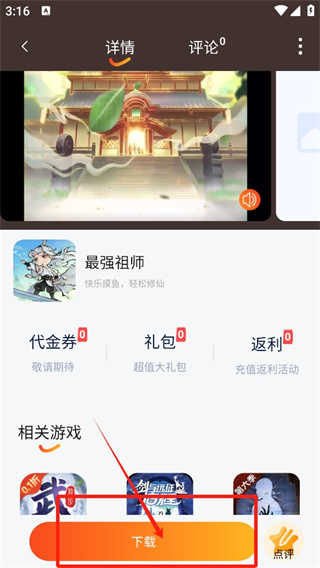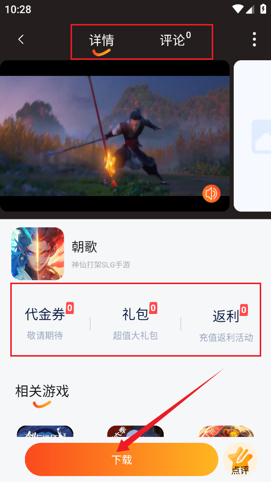 3.点击游戏封面可进入到详情页,这里可以看到关于游戏的介绍,评论,代金券,礼包,返利等信息。如果想要体验游戏,直接点击底部的【下载】即可。