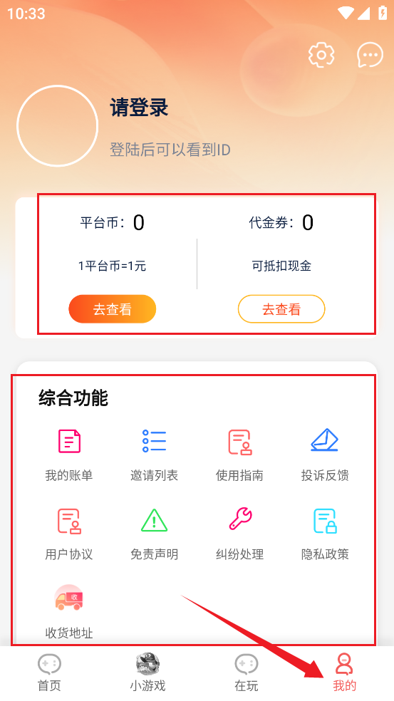 7.进入到【我的】,可以管理自己的平台账号,以及查看平台币,代金券等信息。而且这里还提供了诸多特色功能,如图所示。