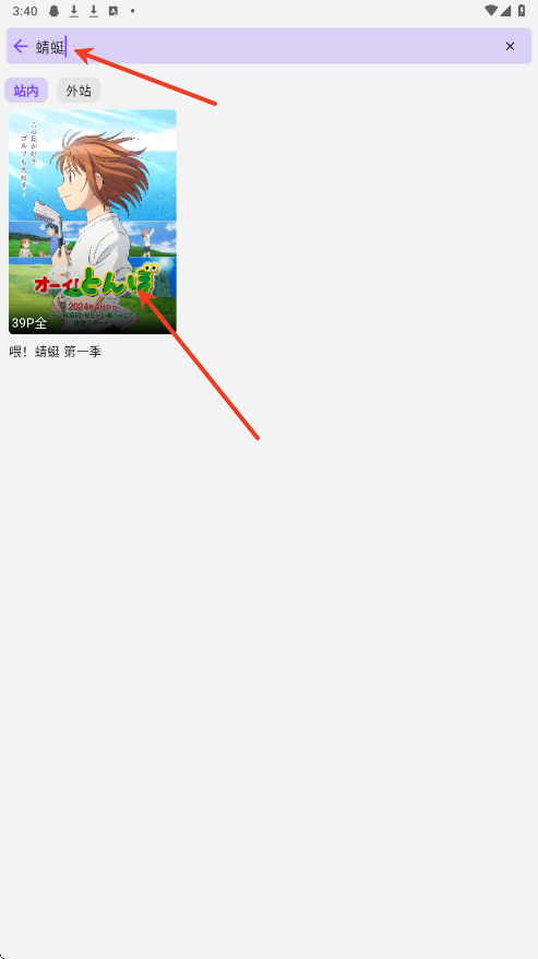 2.输入你要看的动漫名称,查看app搜罗的动漫,点击封面即可开始观看。