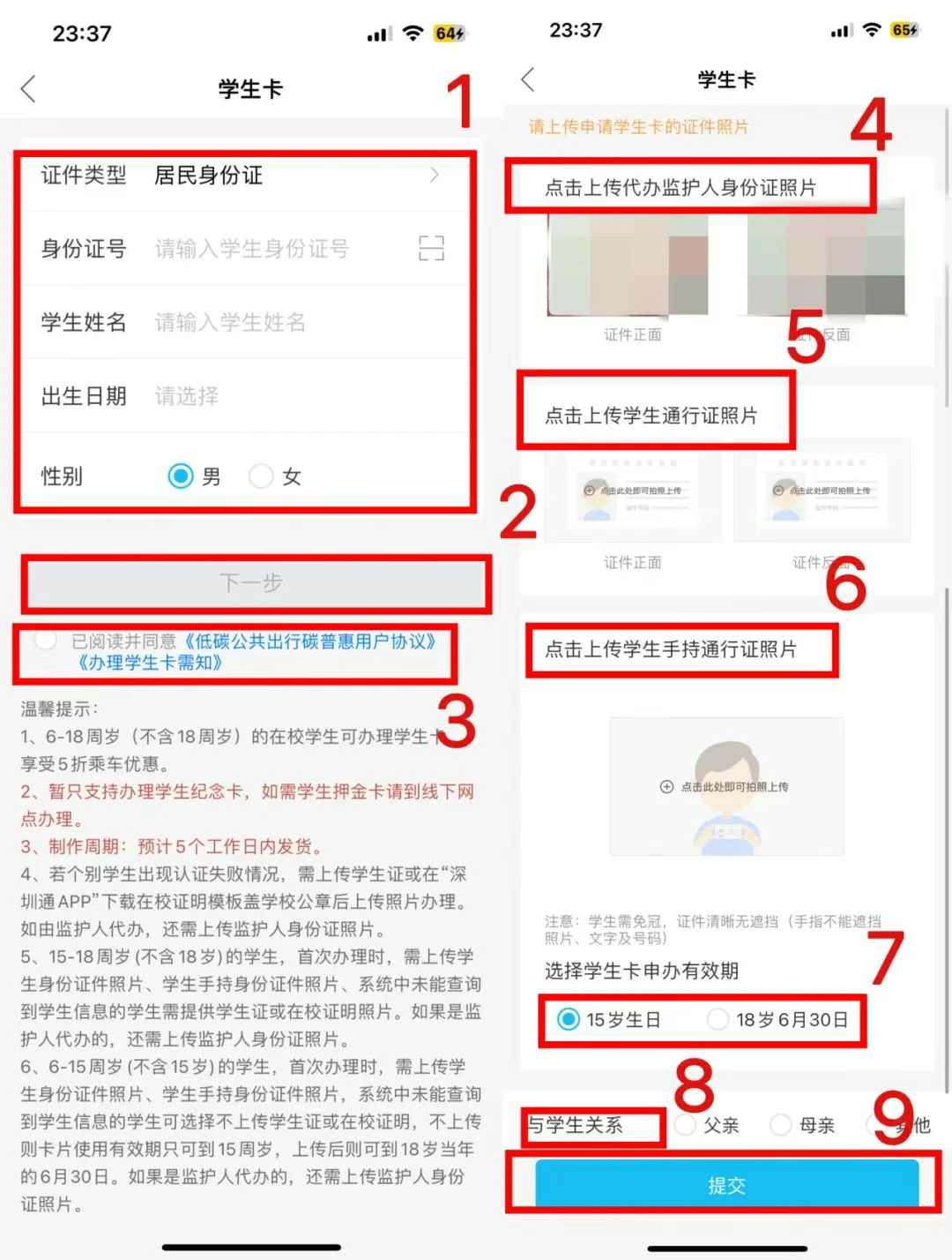 根据提示上传学生信息点击【提交】,根据提示上传代办人证件原件照片,学生证件原件及学生本人手持证件照片,点击【提交】。