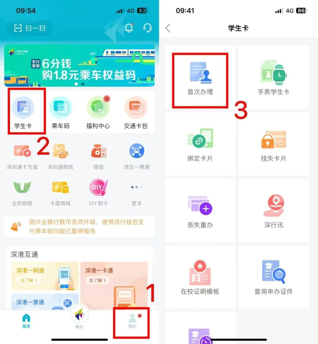 打开深圳通APP,首页点击【我的】,选择【学生卡】,选择【首次办理】(如之前办理的已丢失,则应选择【丢失重办】)