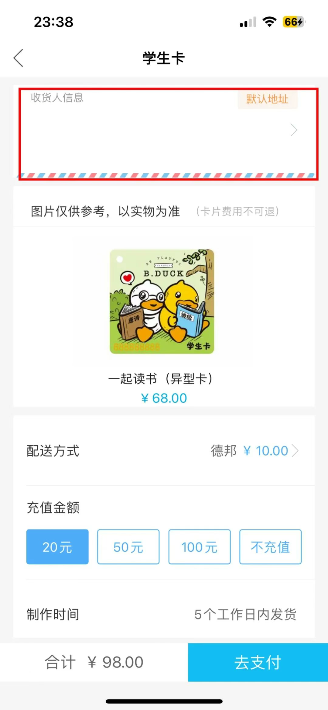 填写收件地址,选择充值金额,点击【支付】。