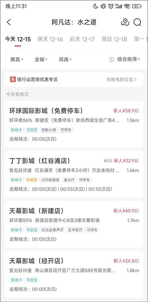 4、进入一家电影院后可以查看到近几天的播放的电影、场次和开场时间,点击右边的购票。