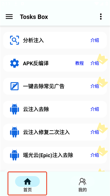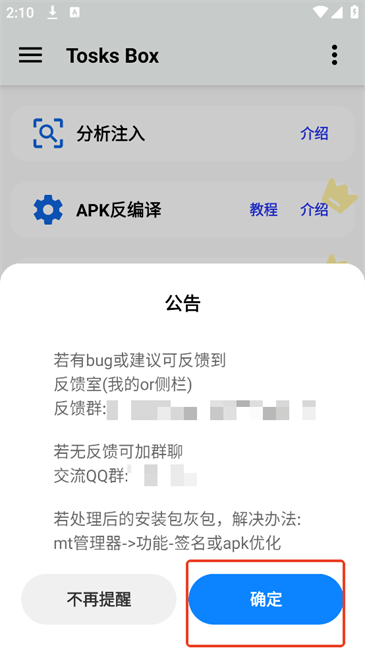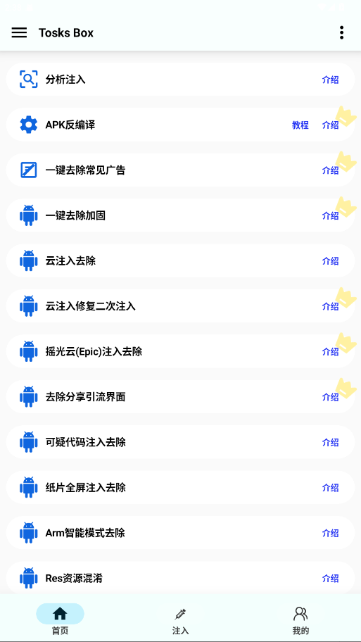 Tosks Box是一款集成多种逆向与安全处理功能的一站式工具箱,专为应用分析与优化而设计。支持可疑代码、云注入、纸片全屏等多类型注入去除,具备资源混淆、脱壳、去加固、广告清理、签名校验绕过等实用功能,并提供iApp逆向、Lua解密、Hook注入与检测等高级工具。操作高效便捷,功能覆盖全面,助力开发者与安全分析人员快速处理应用、提升安全性与可控性。