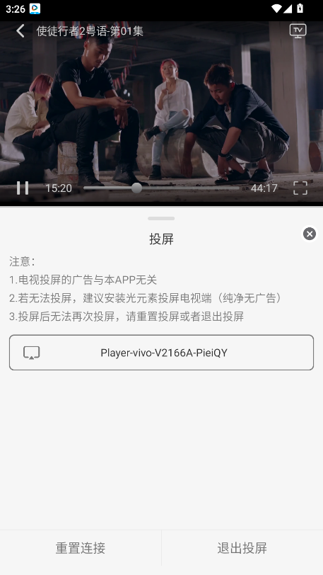 3.保证我们的手机和电视处于同一个WiFi下,然后点击搜索到的投屏设备,即可开始投屏操作了。