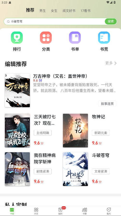 2、“书城”页面,为用户推荐了很多的小说资源。