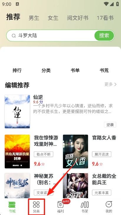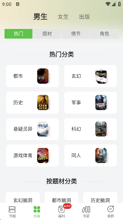 3、“分类”页面,有很多的小说资源,包括言情、科幻以及角色等类型。