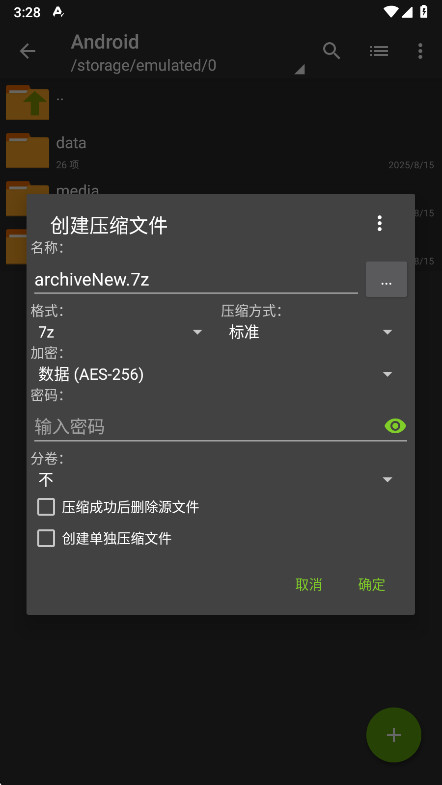 5、填写压缩文件名(可选密码保护),点击“确定”开始分卷压缩。