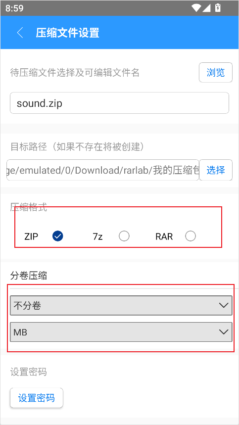 3、在“压缩格式”处选择需要的格式(建议用zip或7z,兼容性好),点击下方分卷。