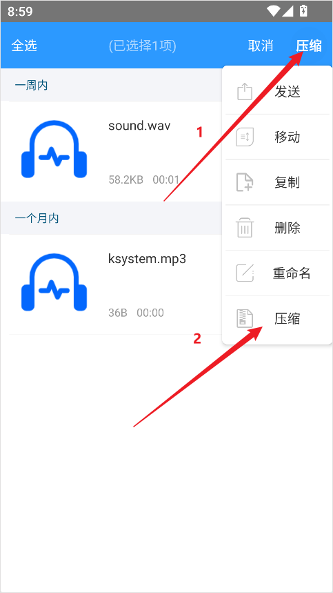2、长按该文件或文件夹,选择右上角“压缩”。