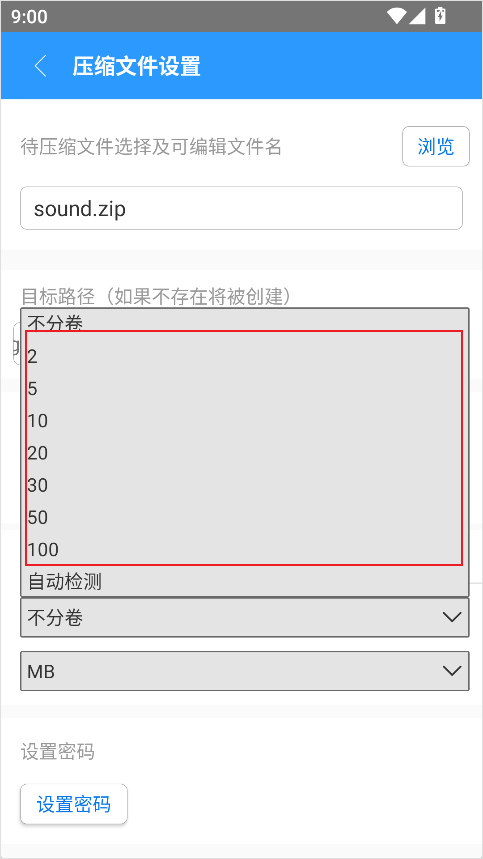4、在“分卷大小”一栏输入每个分卷的大小(如100M、500M等,单位可以用K/M/G)。
