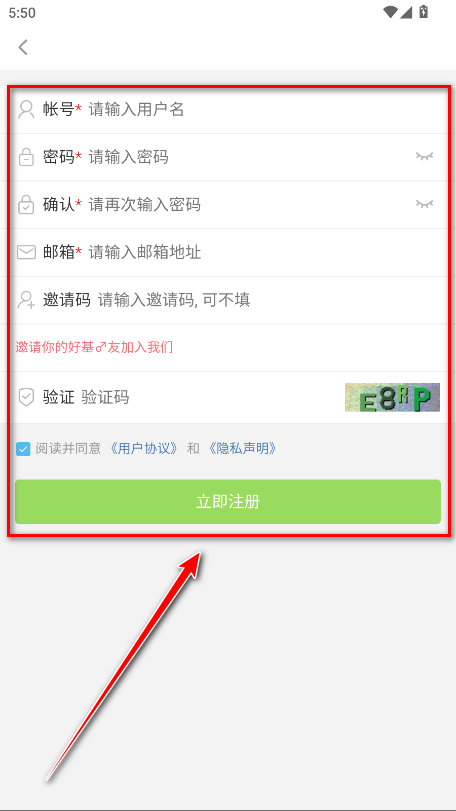 3、请按照软件的要求输入以下信息,勾选阅读并同意用户协议和隐私声明,然后点击立即注册即可。